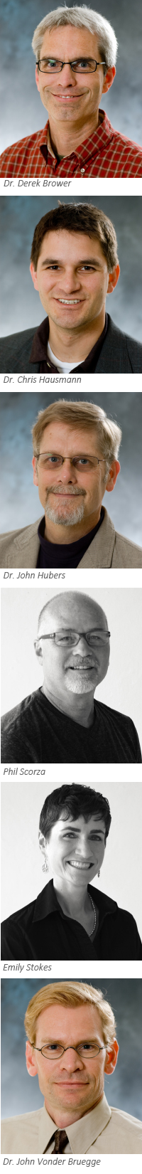 Dr. Derek Brower, Dr. Chris Hausmann, Dr. John Hubers, Phil Scorza, Emily Stokes and Dr. John Vonder Bruegge have all been promoted to the rank of associate professor. Hausmann and Stokes have also been awarded tenure.