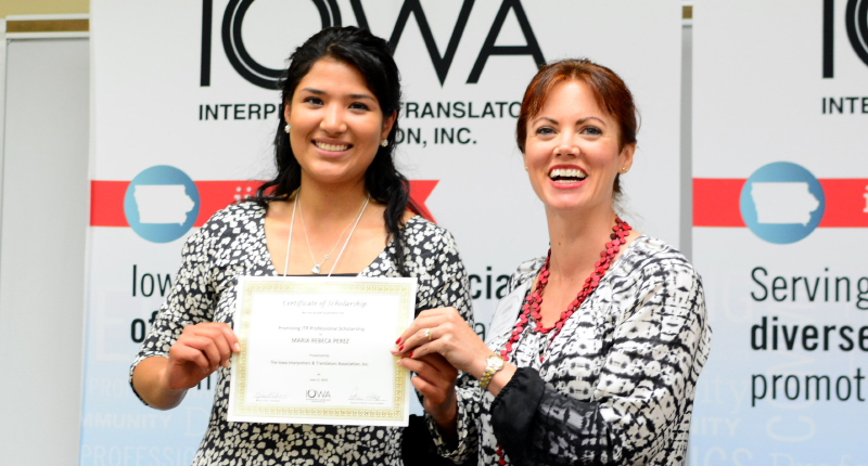 Jeana Clark, president of Iowa Interpreters and Translators Association, presents Maria Rebeca Perez with a scholarship certificate during opening remarks of the organization's 12th annual conference.
