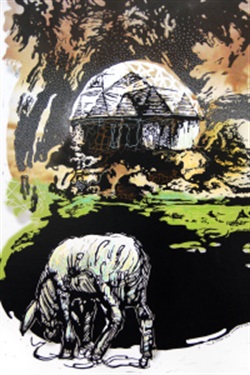 The show will include four series of work. Three of those series feature a combination of printmaking, painting, and in some cases, digital imaging. She first makes prints on paper, then mounts the prints on wood, cuts the wood into organic shapes, and adds drawing and painting. “Vigilant Being” will also include an in-progress sculptural work of interlocking wooden panels that features a panoramic scene.