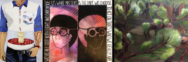 A March 28–31 senior art exhibit at Northwestern College will feature works by Nancy Becerra-Balbuena, including “Renuevame (Renew Me),” an oil on canvas; Carrie Bouwman, including “Sirius Business,” a linocut; and Sharla De Bruin, including “Stagglings,” an oil on canvas.