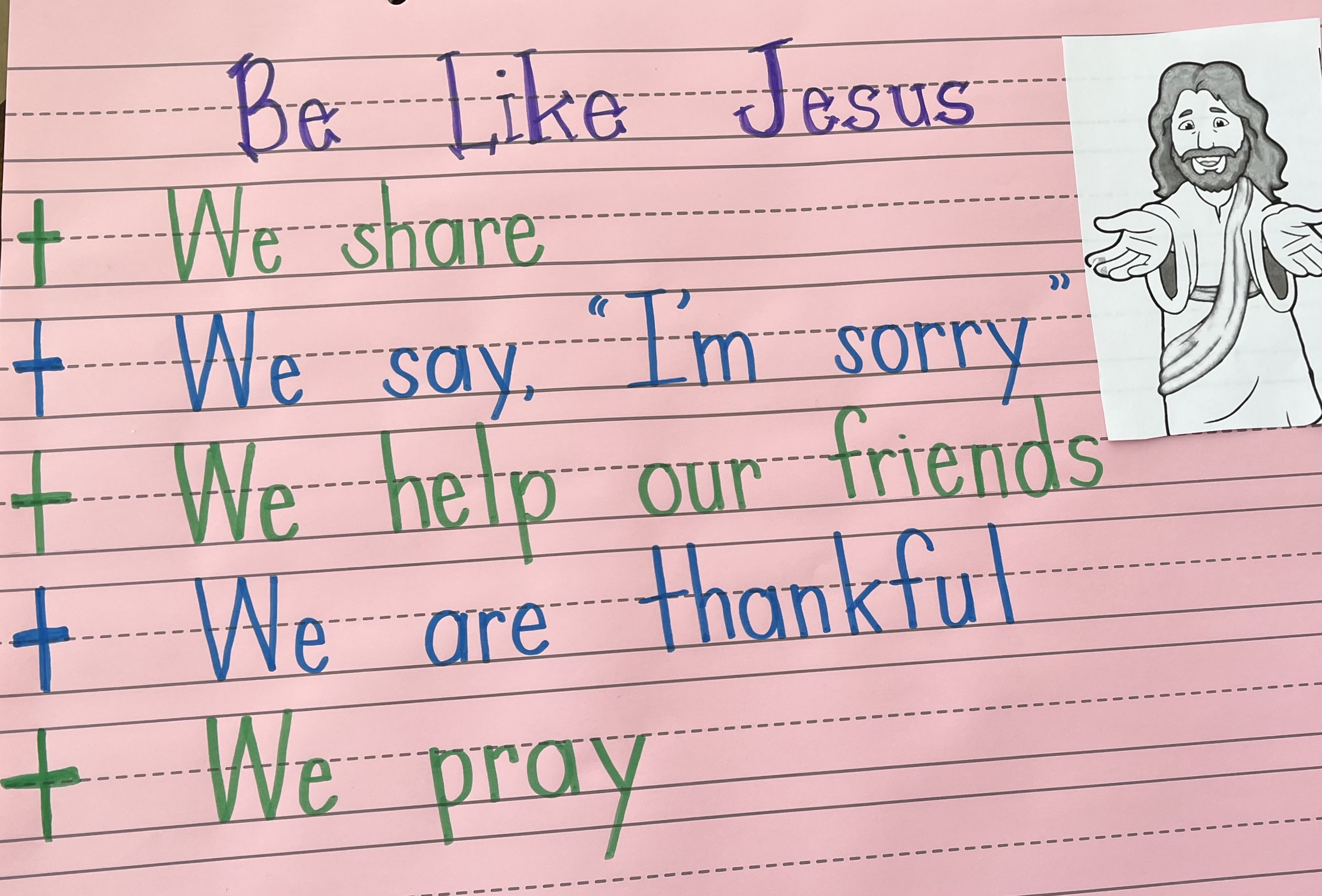The children also take on different roles and responsibilities related to prayer to help take ownership of their faith. For example, classroom jobs assigned to students include setting up the daily prayer space, writing out the petitions, and choosing the Biblical story or song.