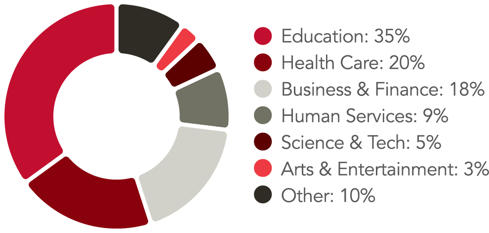 Top industry choices for 2024 grads include education, health care, business & finance, and human services.