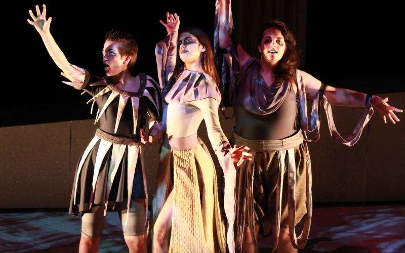 Through her artist’s statements and video, Trewet explained how her films of ink seeping into water were projected onto the “Macbeth” stage to represent the slow, sinister creep of evil into the characters’ minds and lives. Another video of swirling paint colors projected a vivid representation of churning chaos and violence. “I viewed my design as if it were a character in and of itself,” wrote Trewet. “The evil that lurks ... creeps into our minds, invading our motives … and that is how it takes over.”